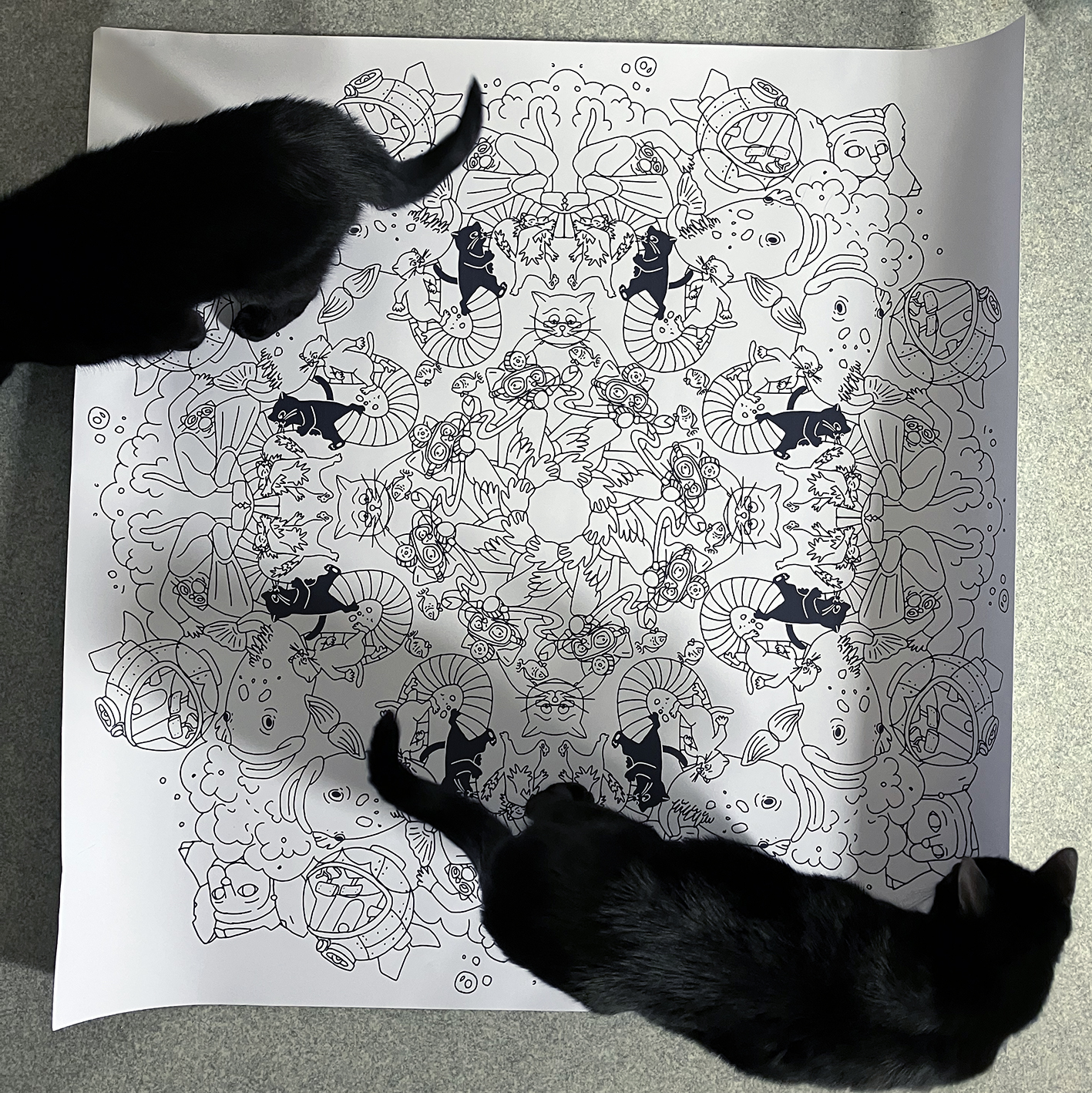 Notre première réalisation de coloriage collectif, un mandala géant 105x105cm, imprimé sur papier 160gr.